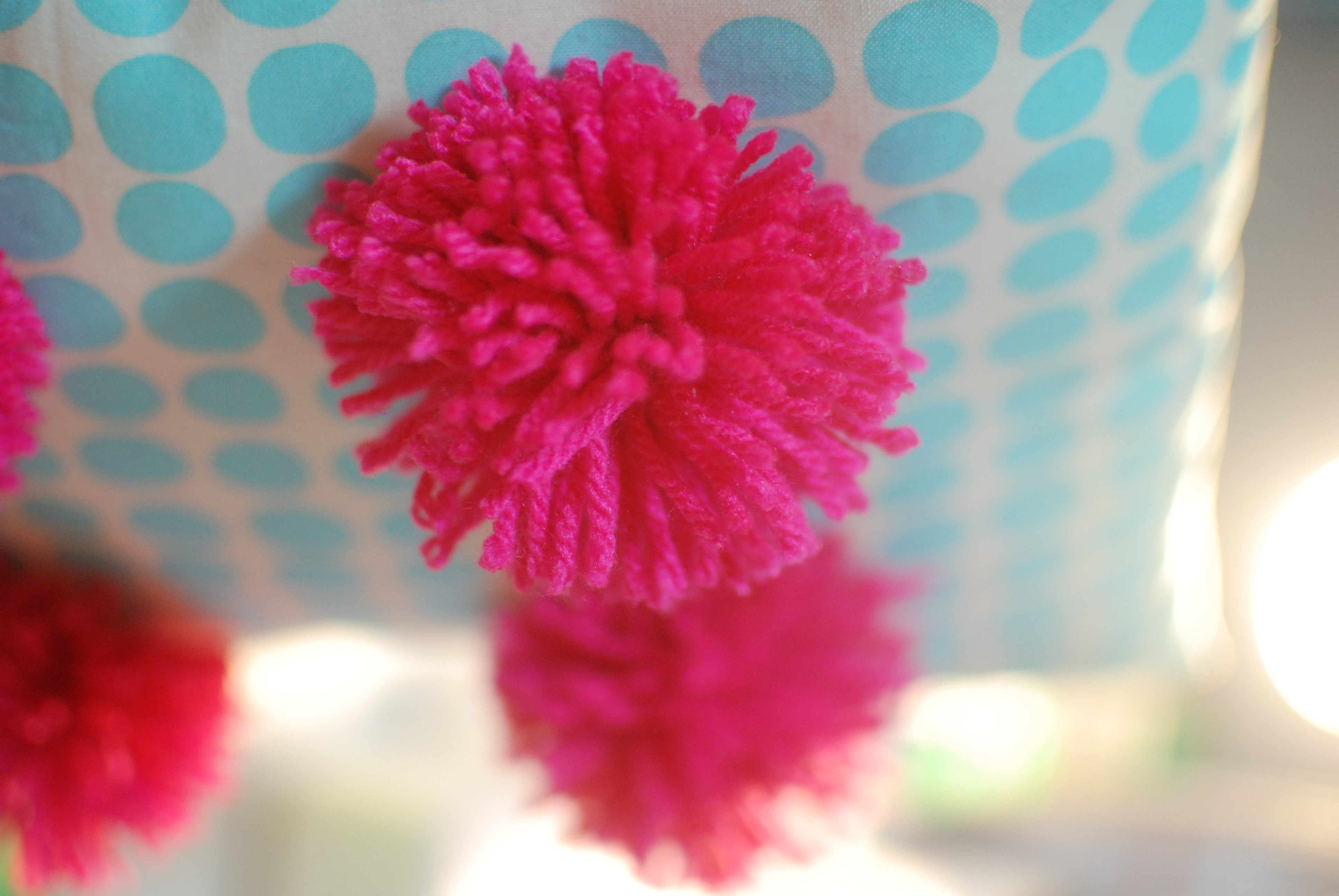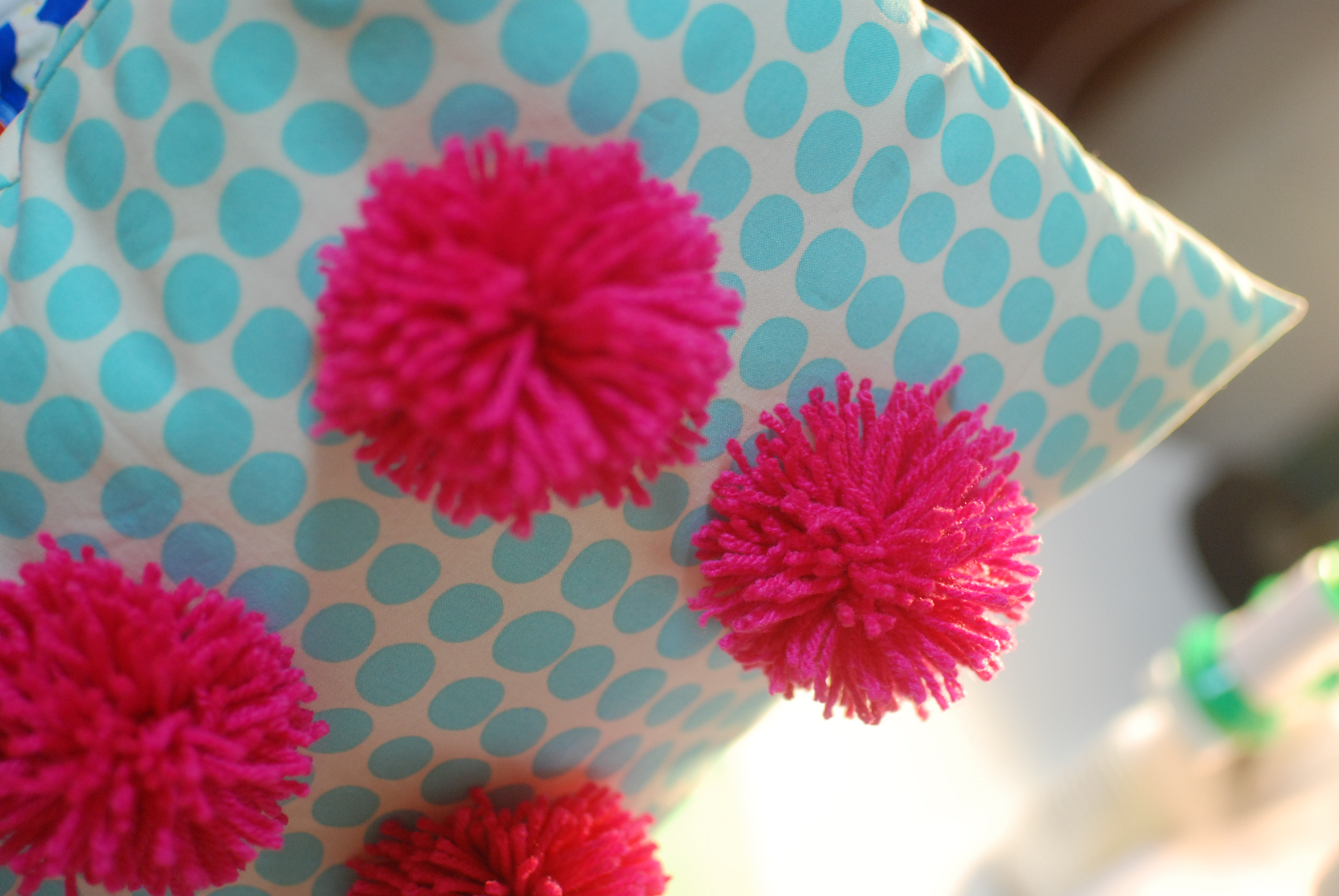 และแล้วหลังจากทำหมอนสุดสวีทหวานแหว๋ว แต่เพื่อนตุ๊กที่สัญญาว่าจะทำให้เค้าเราต้องเปลี่ยนแบบหน่อยดีกว่าเพราะ เพื่อนเราคนนี้ออกแนวห้าวนิดหน่อย เอาละไหนๆก็ไหนๆแล้ว เอาแบบใหม่เลยดีกว่า เปิดหนังสือหาแบบได้ซักพักนึกขึ้นมาได้ว่ามีแบบนึงอยู่ในใจนิ เอาละรอบนี้ต้องลองทำให้ได้ วิ่งไปค้นผ้าที่เก็บไว้ในลังสองลังใหญ่ อะฮ่า ลายจุดสี Aqua อันเก่งของเรายังอยู่ ไหมพรมสีชมพูแปร๋นก็ยังมี เสร็จเรา…. แต่ปอมปอมอันใหญ่นี่ซิ จำไม่ได้แล้วว่าทำยังไง YouTube ไม้ตายของเราช่วยชีวิตเราได้เสมอ และก็จริง สุดท้ายก็ได้ปอมปอมอันใหญ่อย่างที่ใจอยากได้ในที่สุด 6 อันเลย