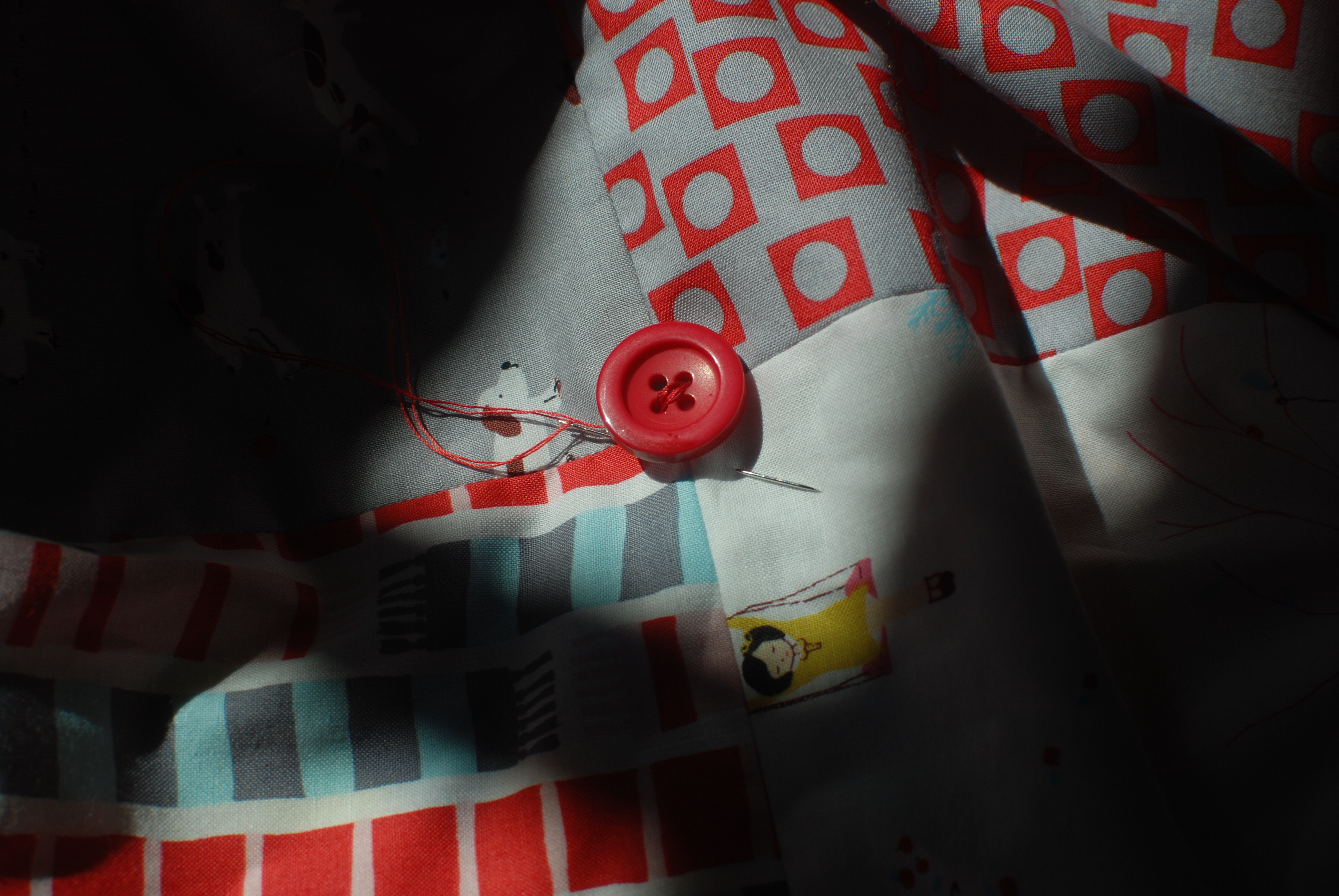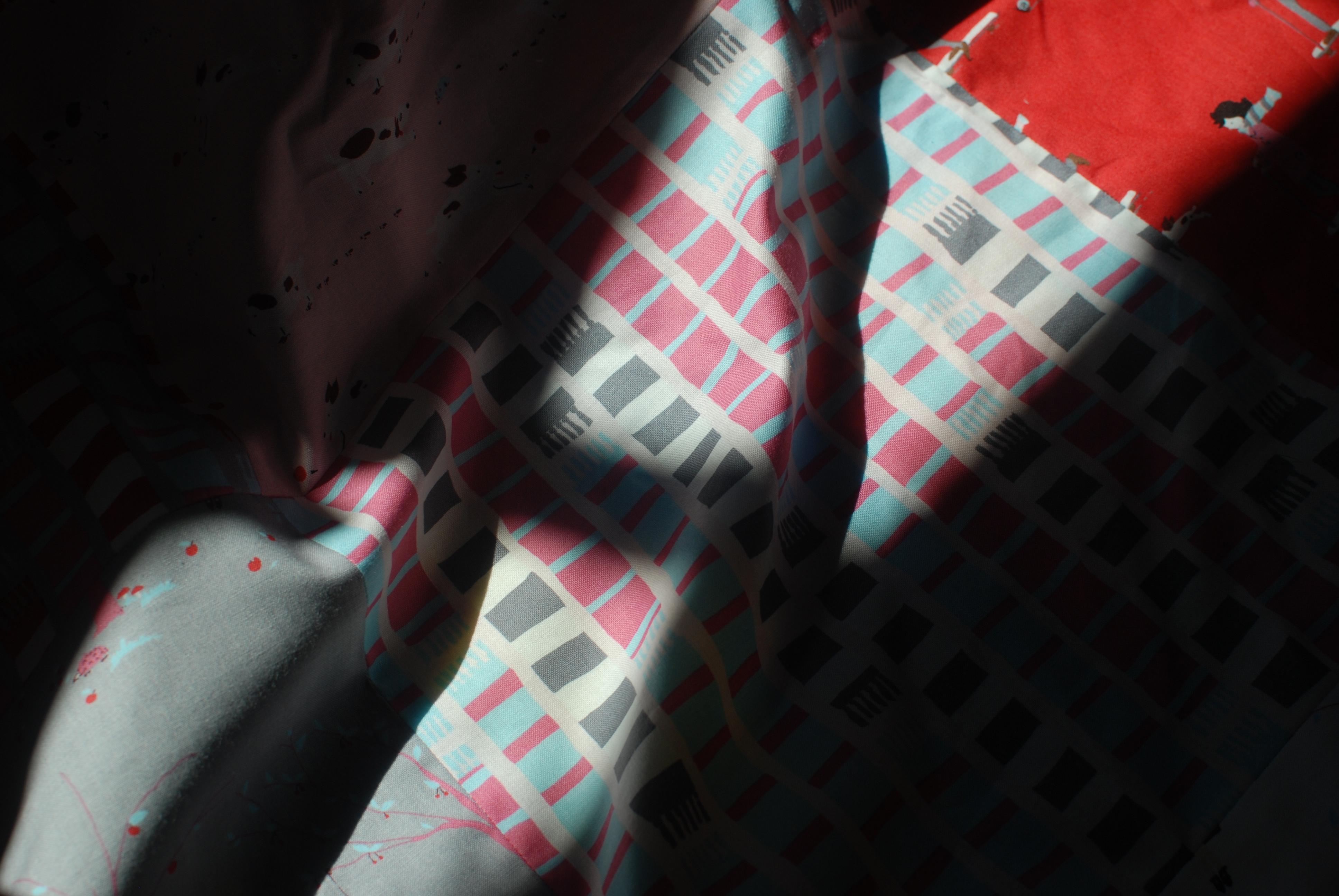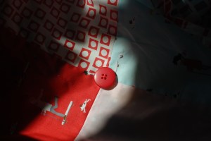 กลับหัวสามเหลี่ยมเป็นแนวตั้งอีกรอบและตัดผ้าอีกหนึ่งชิ้น หลังจากนั้นก็กลับหัวสามเหลี่ยมลงตัดผ้าอีกชิ้นนึง เพราะฉะนั้นเราจะมีสามเหลี่ยมฐานสีแดงสองชิ้น และสามเหลี่ยมฐานสีขาวสองชิ้น พอเอามาเรียงประกอบหันหน้าตาก็จะออกมาเป็นแบบนี้คะ